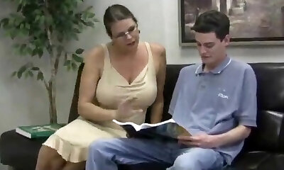 мама рыжая учительница тренирует младшего ученика с огромным стояком